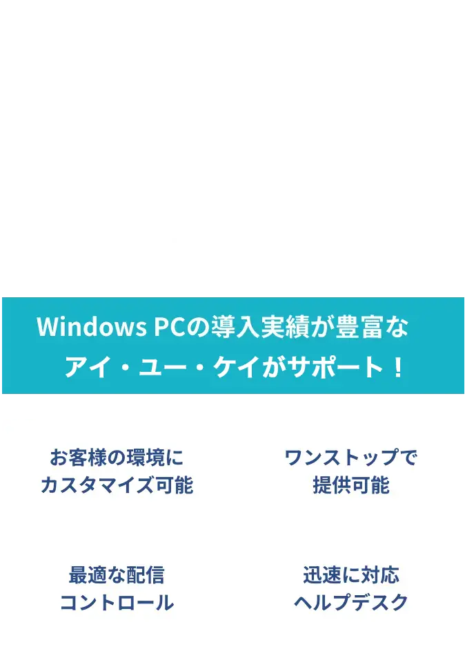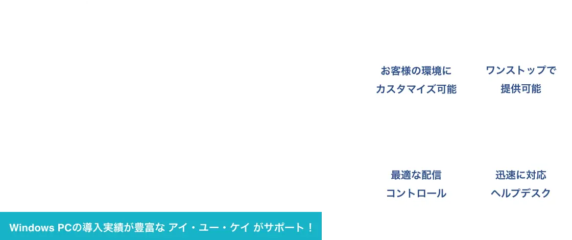 アイ・ユー・ケイの移行サポートは、既存PCのバージョンアップのほかに、新規PCの調達からリプレイス、周辺機器の購入、導入後のヘルプデスク提供など、 お客様の環境や体制に応じて必要なサービスのみを選択ことが可能です。