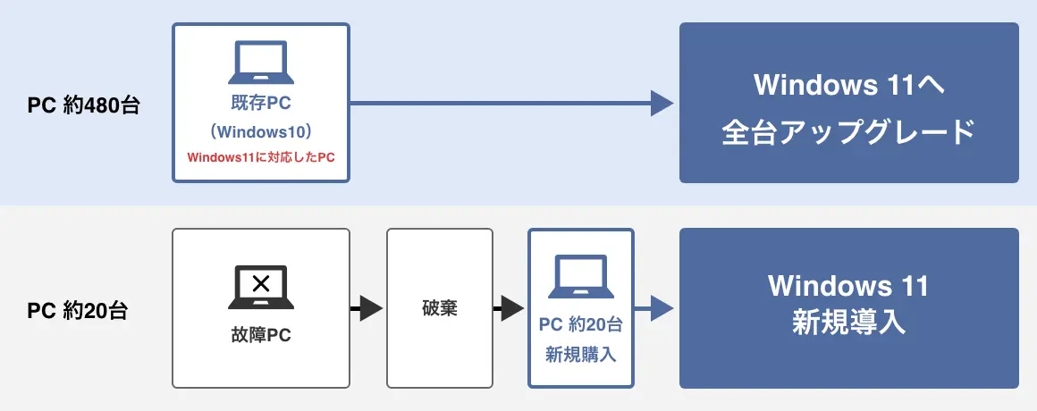 既存の480台はWindows11に対応可能なPCであったため、全台Windows10からのアップグレードを実施しました。