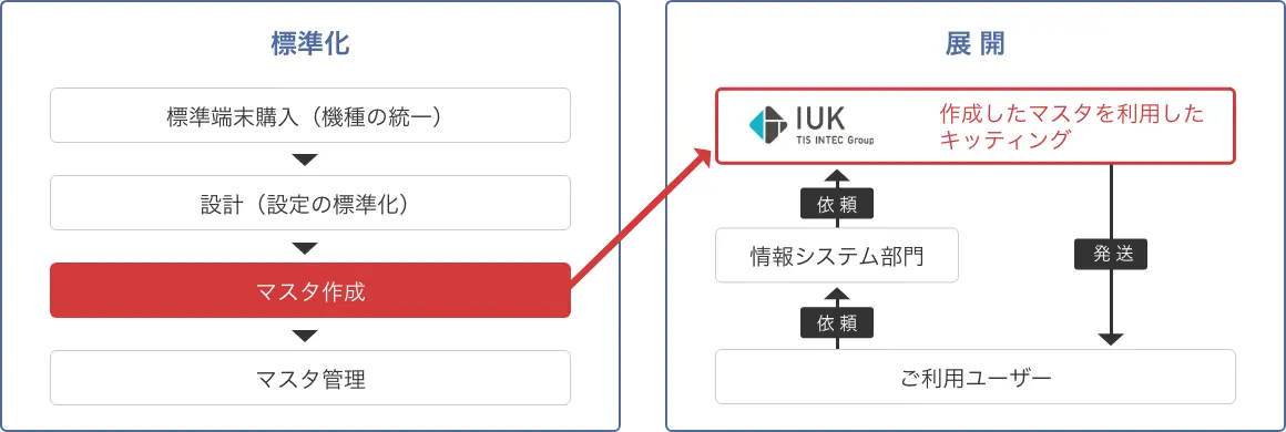 まずは標準端末を購入し、PC設計で設定を標準化し、マスタの作成、管理を行いました。