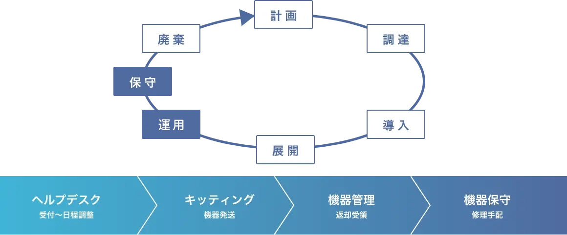機器の購入からユーザー様の依頼受付、キッティング、機器発送、返却対応、PCの破棄、買取の引き渡しまで、