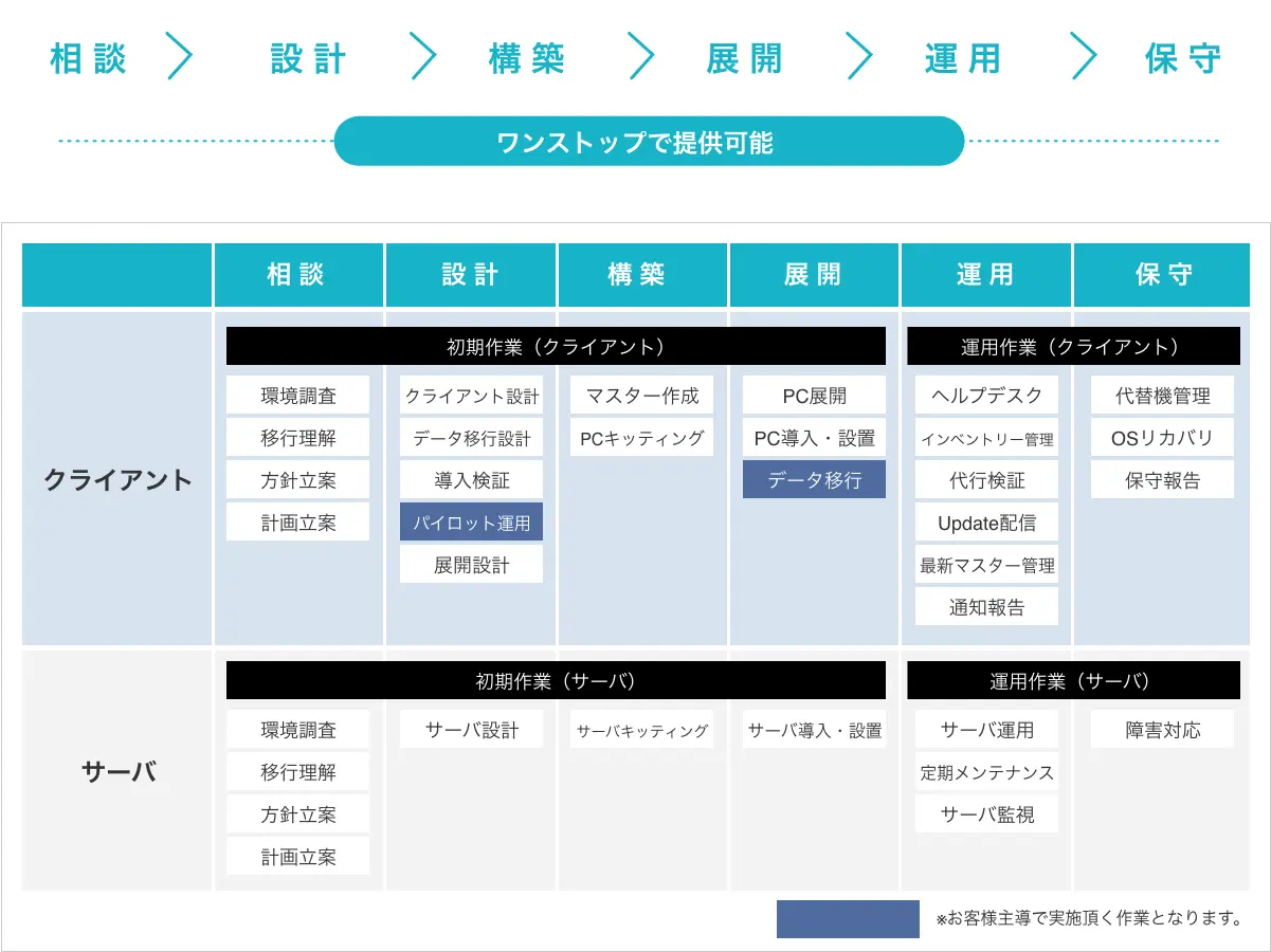 アイ・ユー・ケイの移行サポートは、 計画から機器購入、キッティング、保守、不要PCの廃棄まで、ワンストップでのサービス提供が可能です。