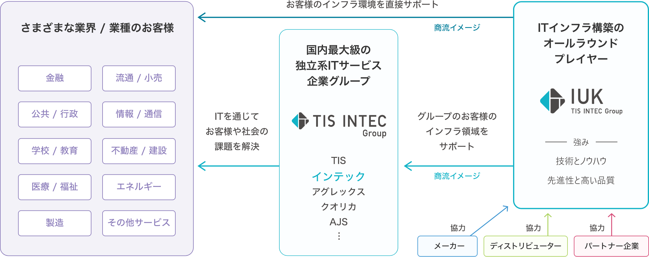 わたしたちアイ・ユー・ケイ(IUK)は、企業活動をIT分野で支えるITインフラの設計、構築、運用までのトータルサービスを提供し、DX化の推進で次々と生まれるニーズに対応するためサービスを拡充させています。